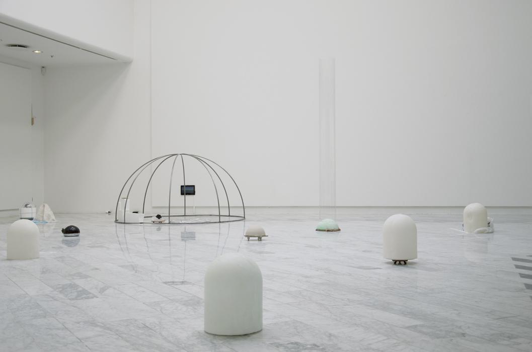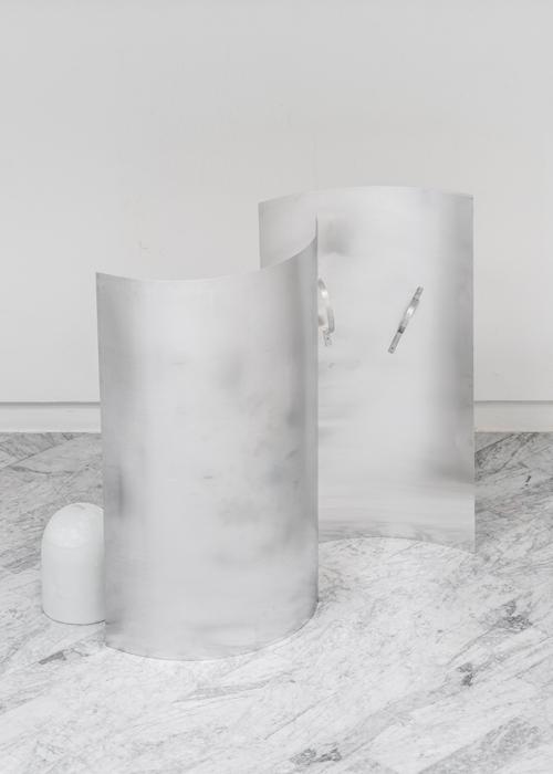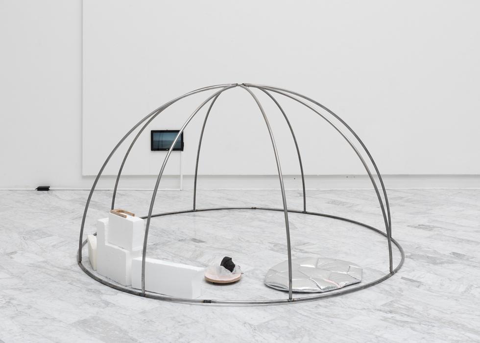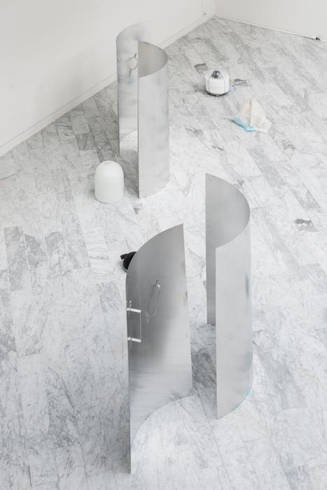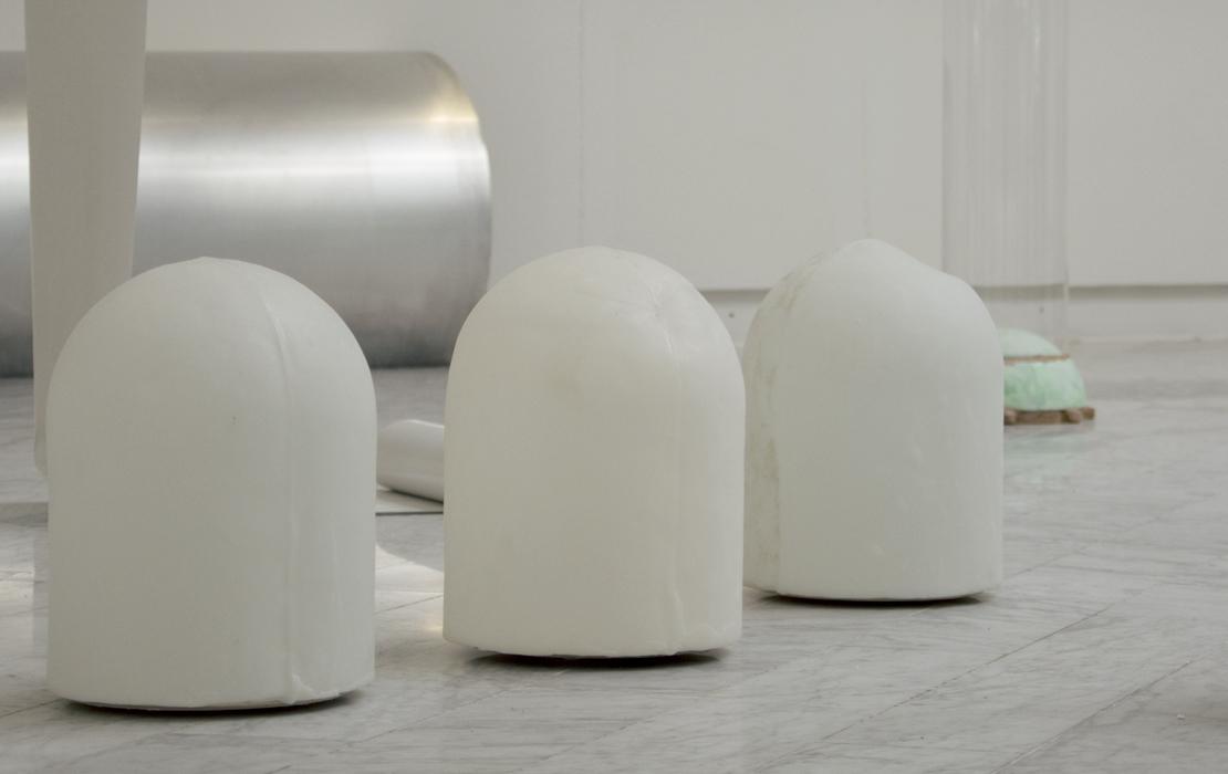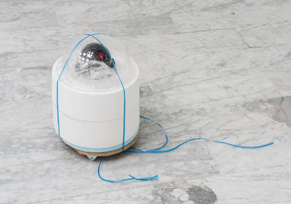 aluminium, steel, modelling wax, paraffin, beeswax, clay, MDF, wheels, plexiglas, plastic, bronze, styrofoam, video, vinyl, dummy surveillance camera, fabric, foam, laser-cut plywood, copper wire, spray-paint, pigment, raffia, plaster, chipboard, glad wrap