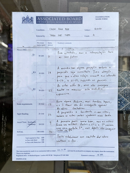 altered digital scan of examination mark form, translated examiner's comments (translation: Bruno Zhu), handwriting