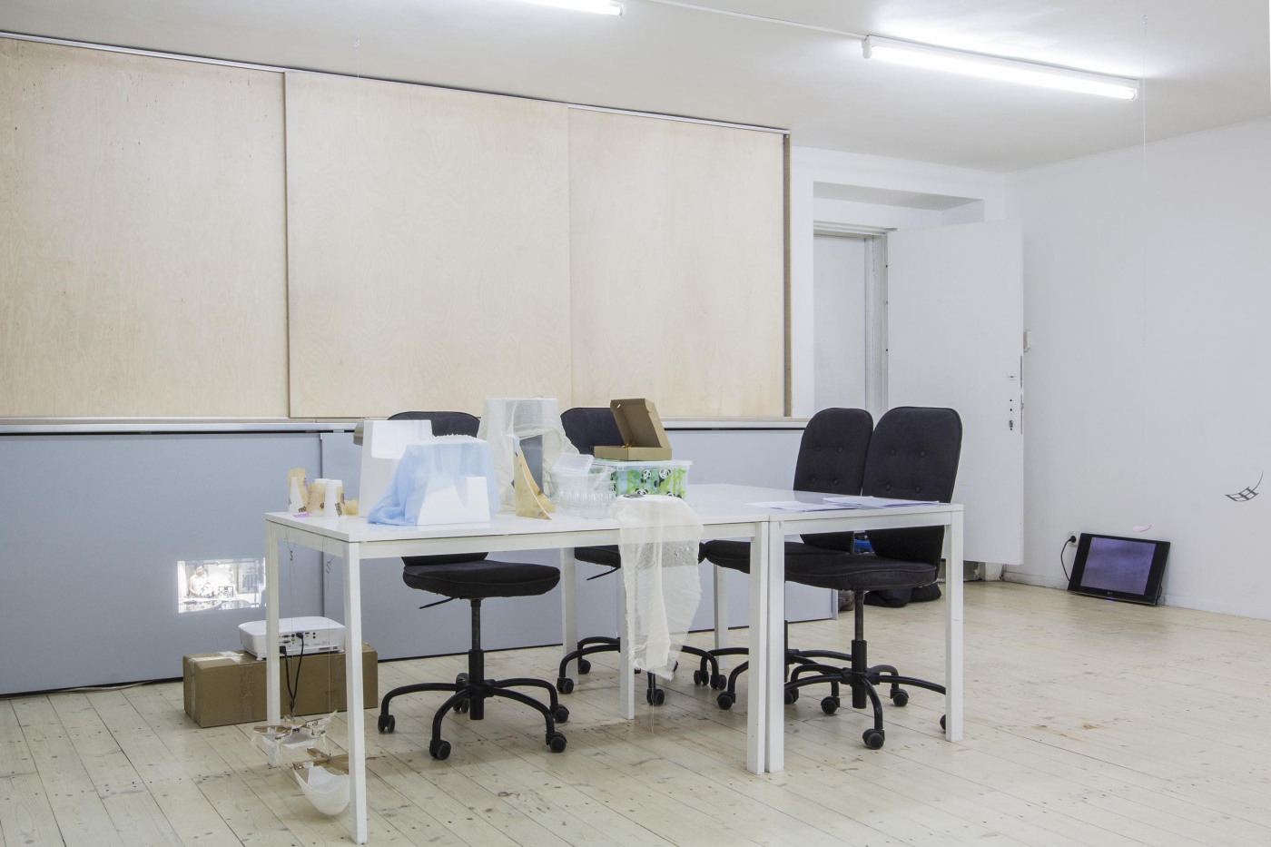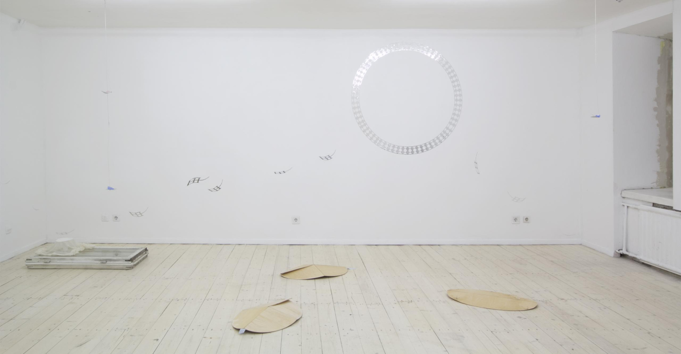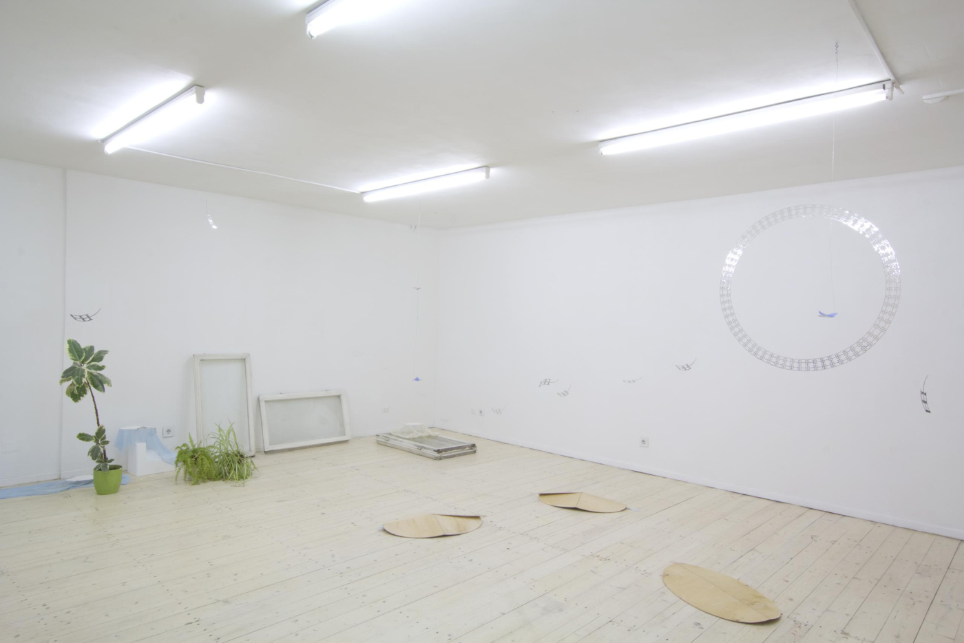 vinyl, laser-cut aluminium, wire, steel cable, fasteners, plastic, plywood, piano hinges, linen, wood glue, wood, discarded iMac boxes from Pakrante, cable ties, ink on organza, plaster, tulle, mull, plastic cups, styrofoam, ink on organza, wood, wire, S-hooks, fasteners, old windows removed from space, Editorial office house plants