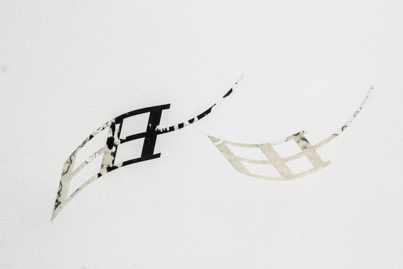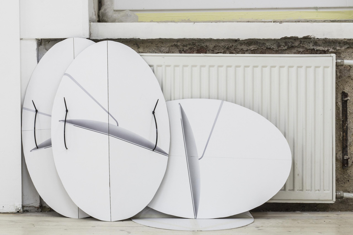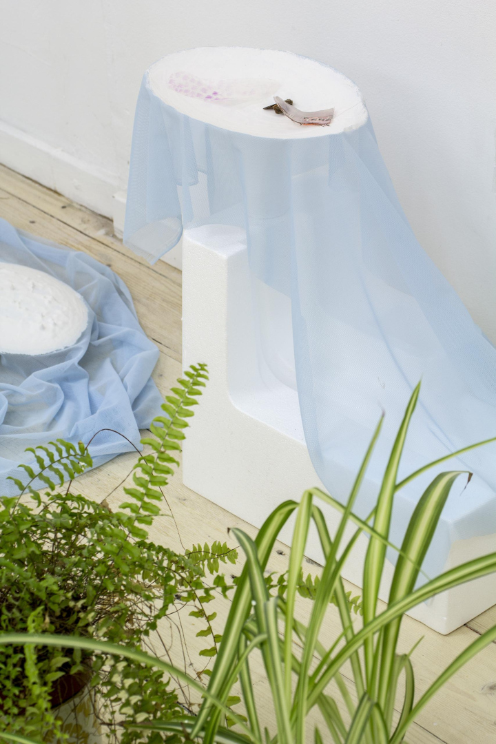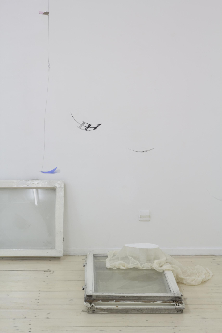 vinyl, laser-cut aluminium, wire, steel cable, fasteners, plastic, plywood, piano hinges, linen, wood glue, wood, discarded iMac boxes from Pakrante, cable ties, ink on organza, plaster, tulle, mull, plastic cups, styrofoam, ink on organza, wood, wire, S-hooks, fasteners, old windows removed from space, Editorial office house plants