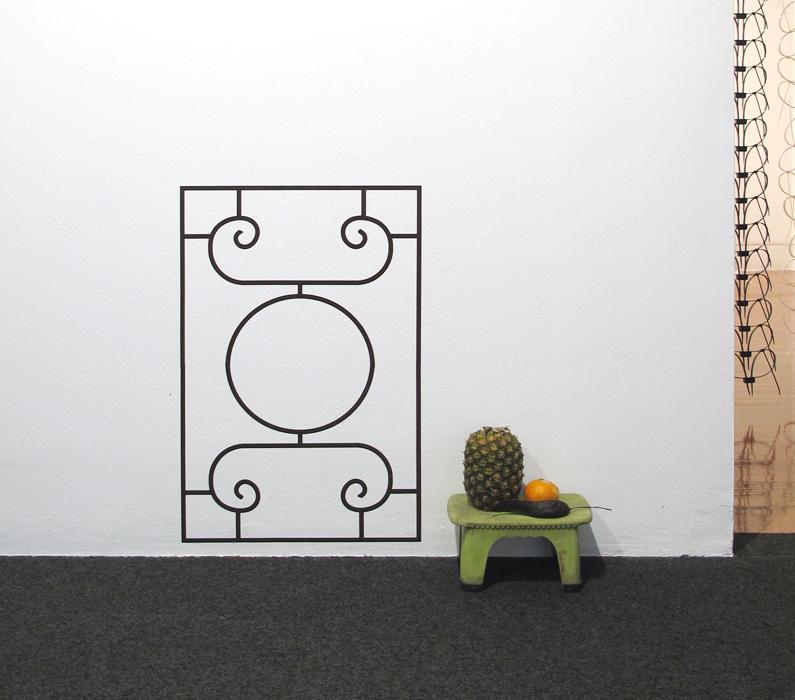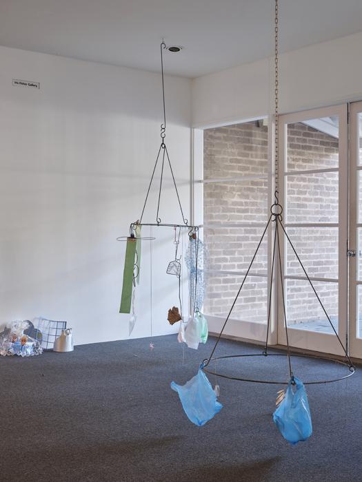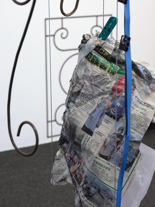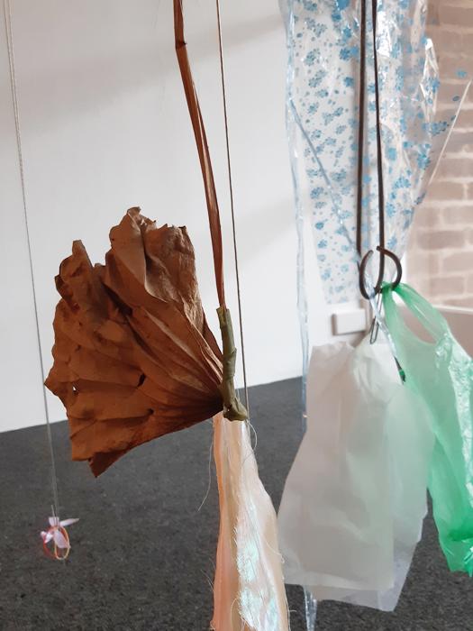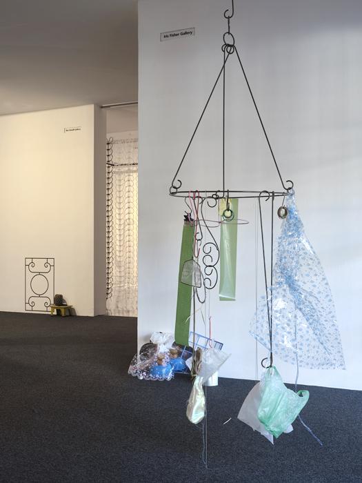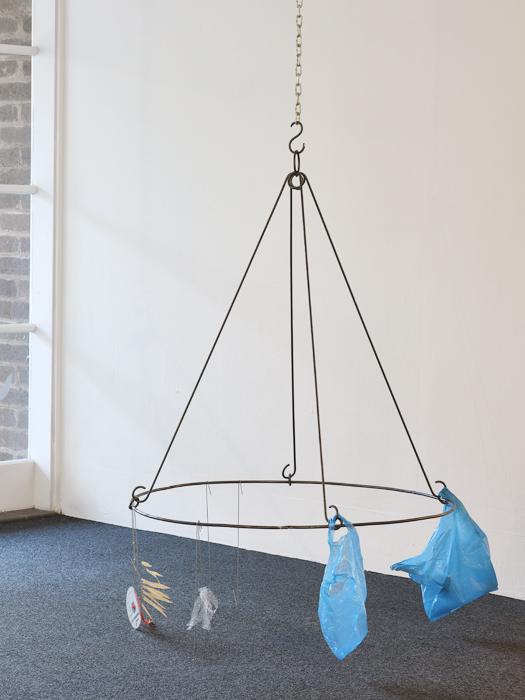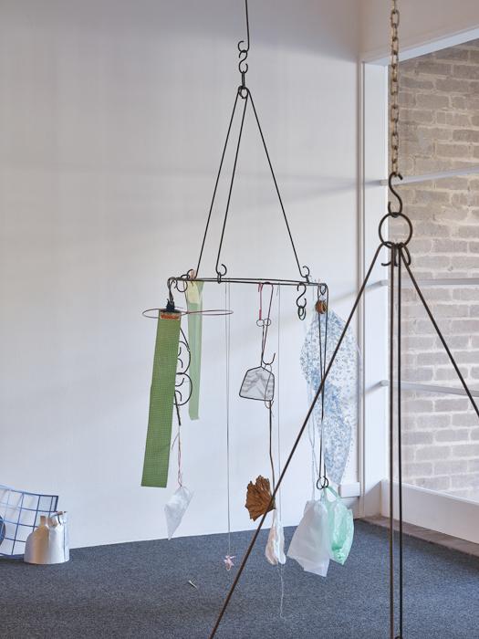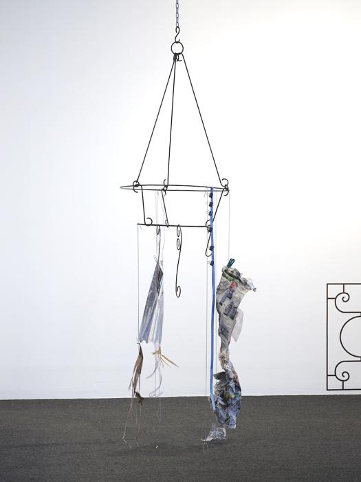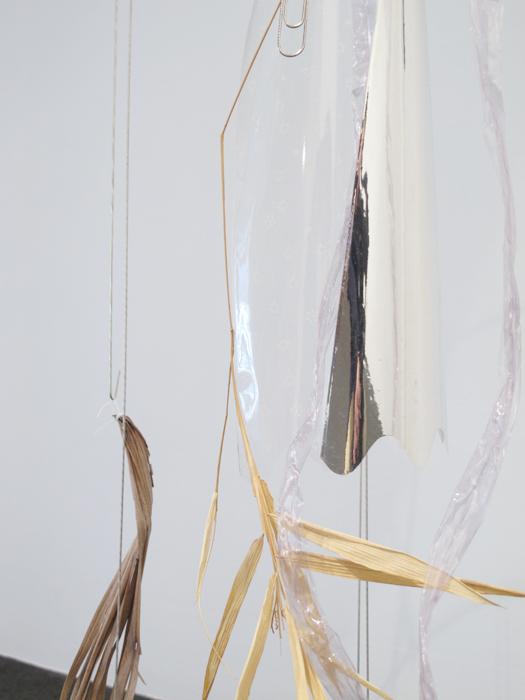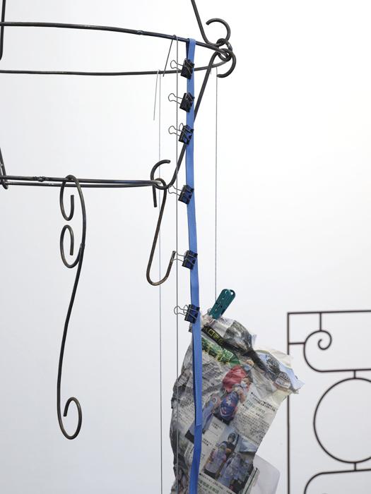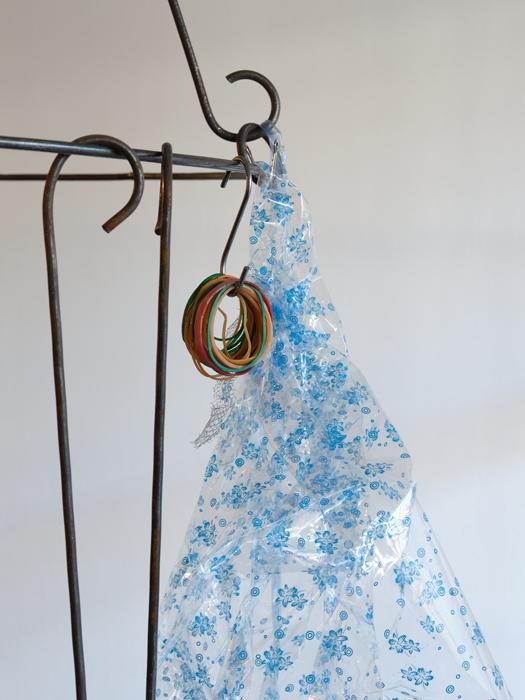 vinyl, steel, fruit, plastic stool, raffia, plastic bags, plastic sheets, lurex, dried bamboo leaves, dried lotus leaf, organza, thread, laundry clips, hangers, newspaper, straw, paper clips, ties, clips, wire, rubber bands, s-hooks, compact disc, net, hair clip, found objects.
