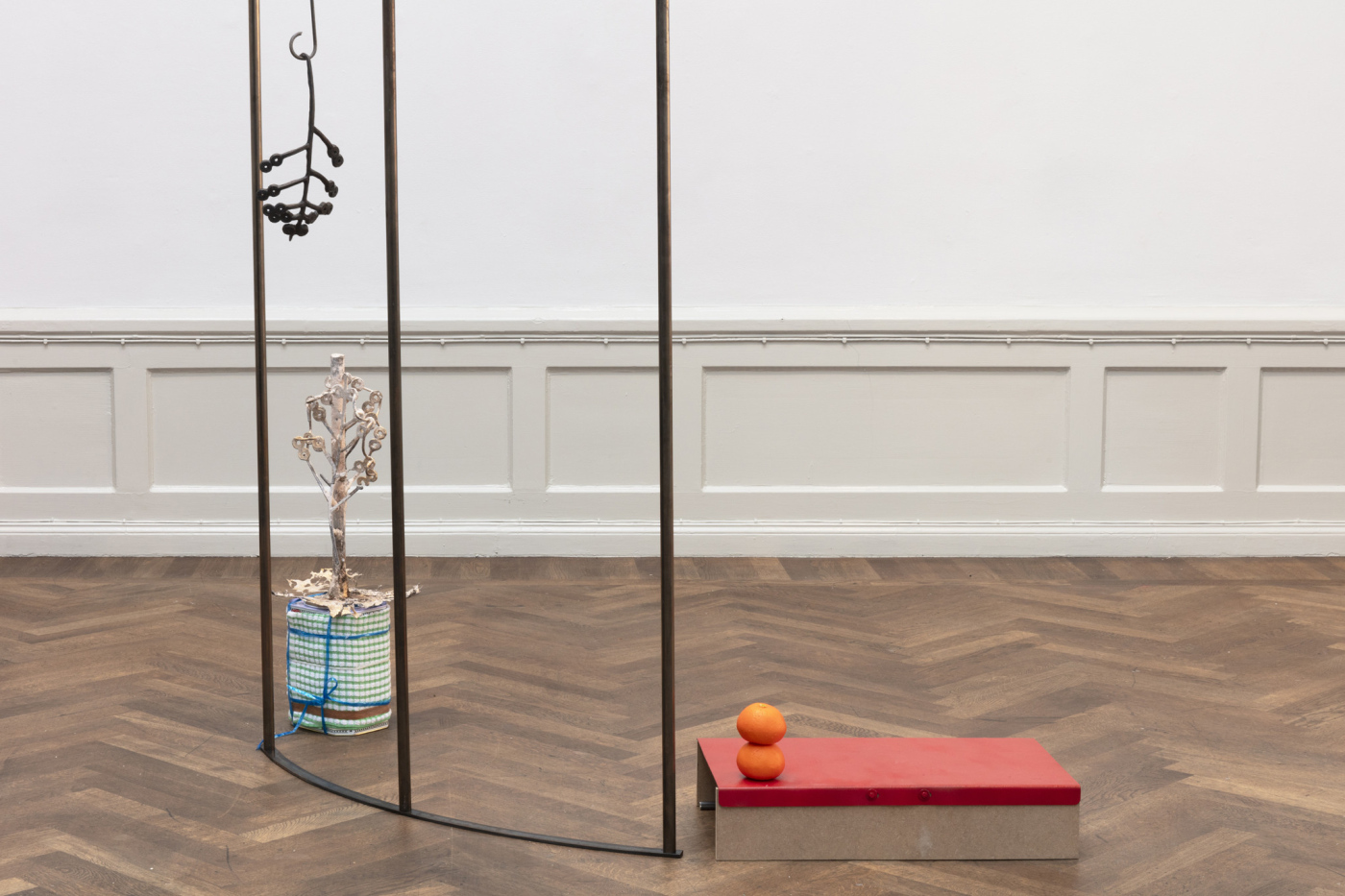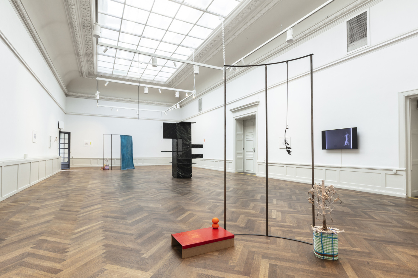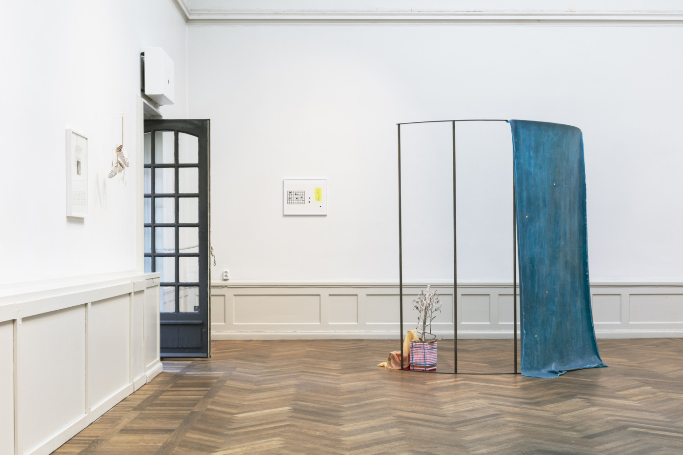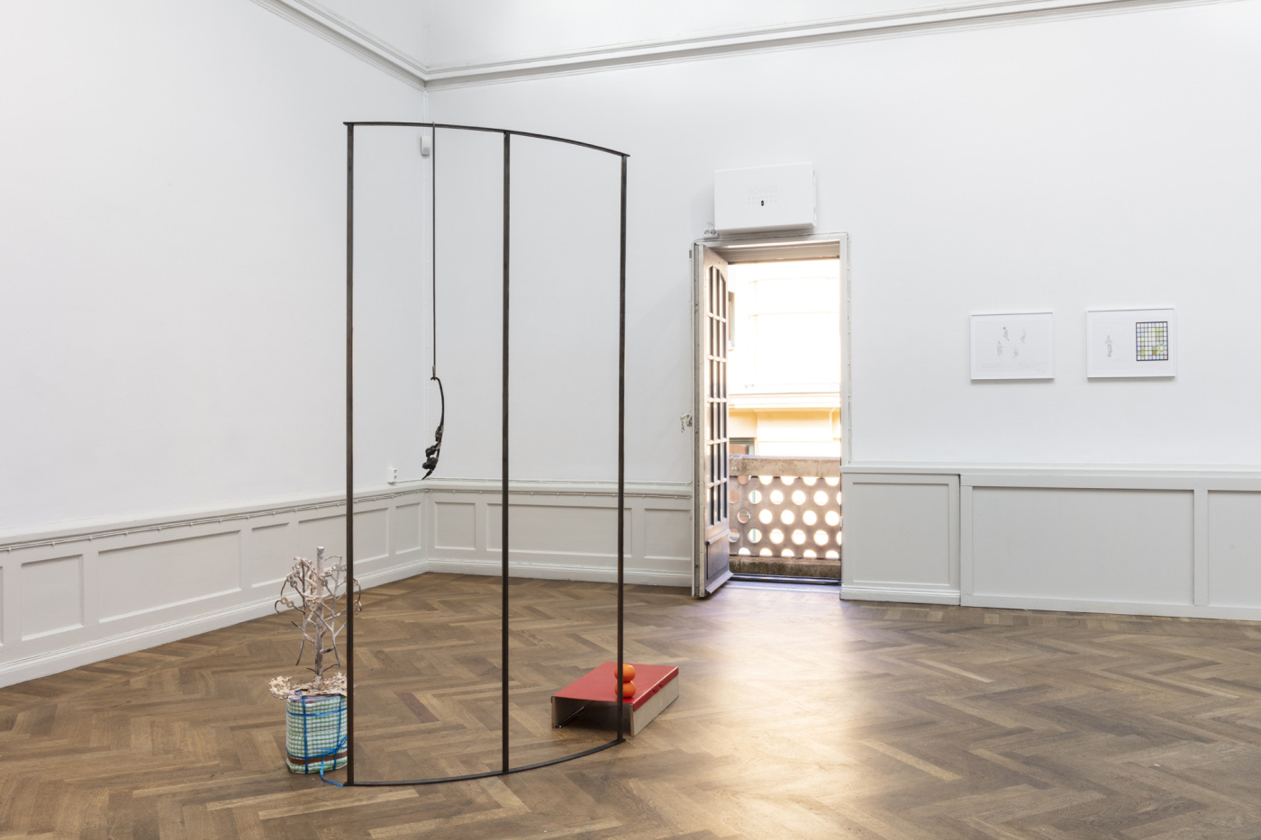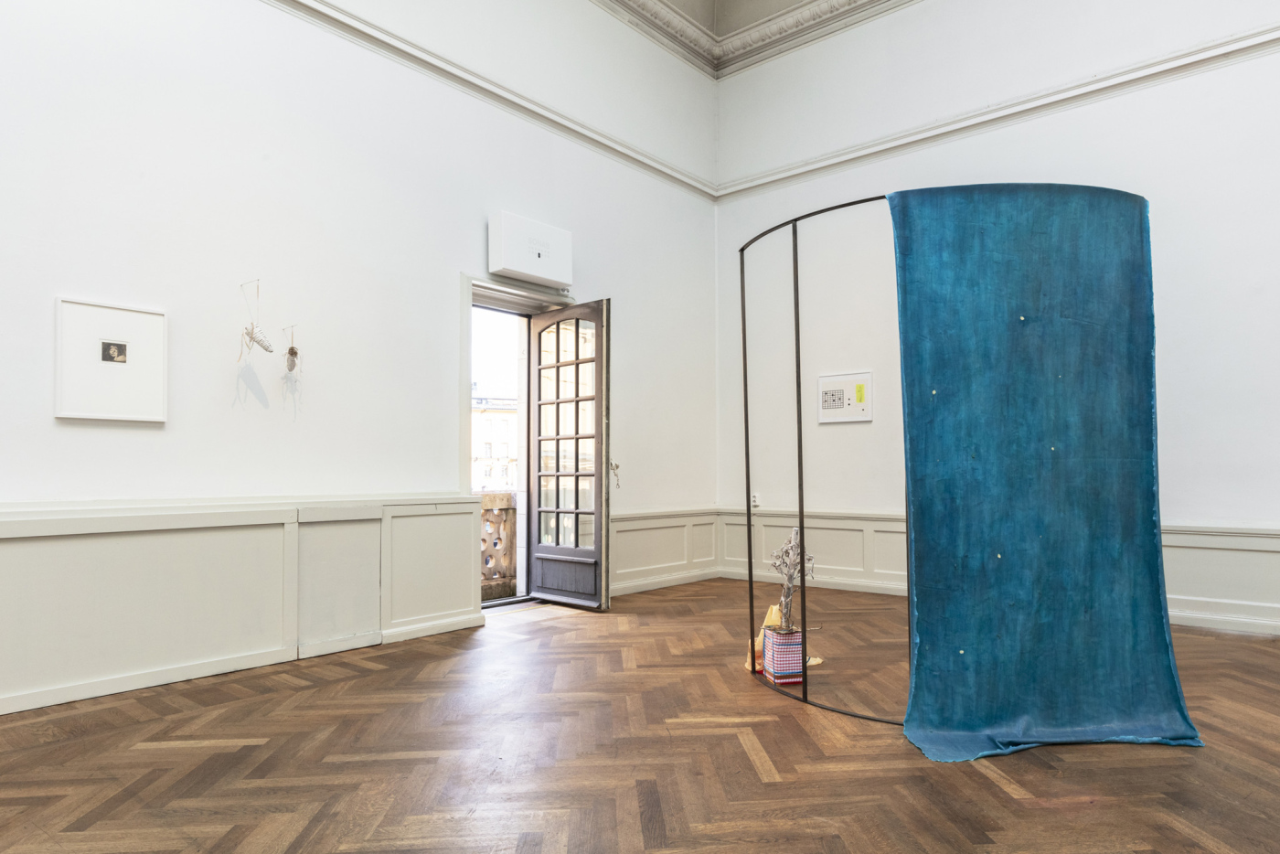 The exhibition consists of existing and new works, some developed in dialogue with the building. Two open balcony doors bring a slight breeze to the gallery and leak noise from the street outside. "