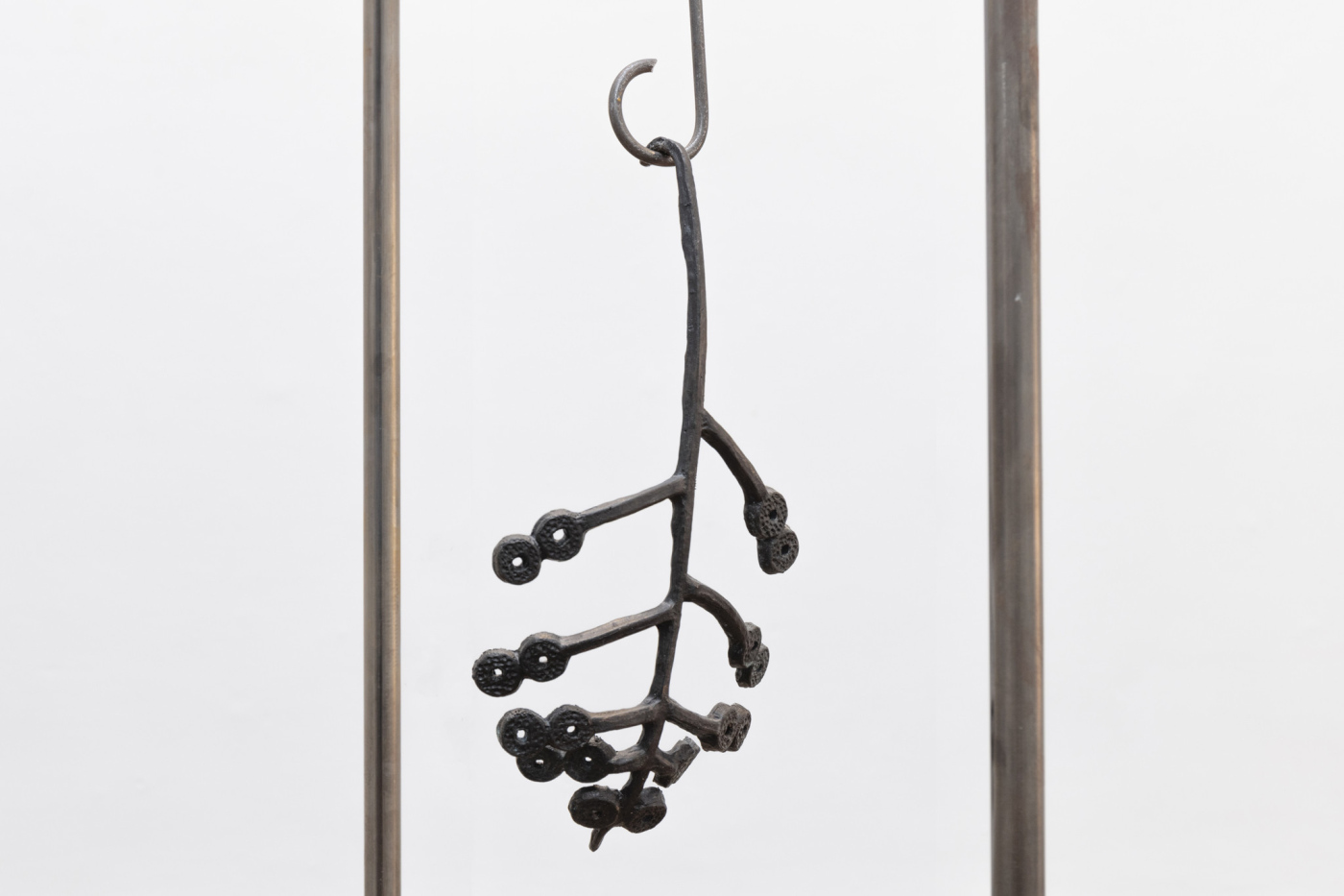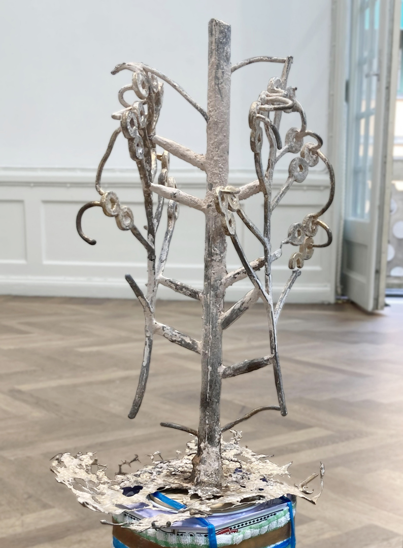 Money Tree (I & II) (2024), cast bronze, plaster, chamotte, plywood, threaded rod, nuts, wood, concrete, raffia, dishcloth, rubber bands, biscuit tins, beeswax