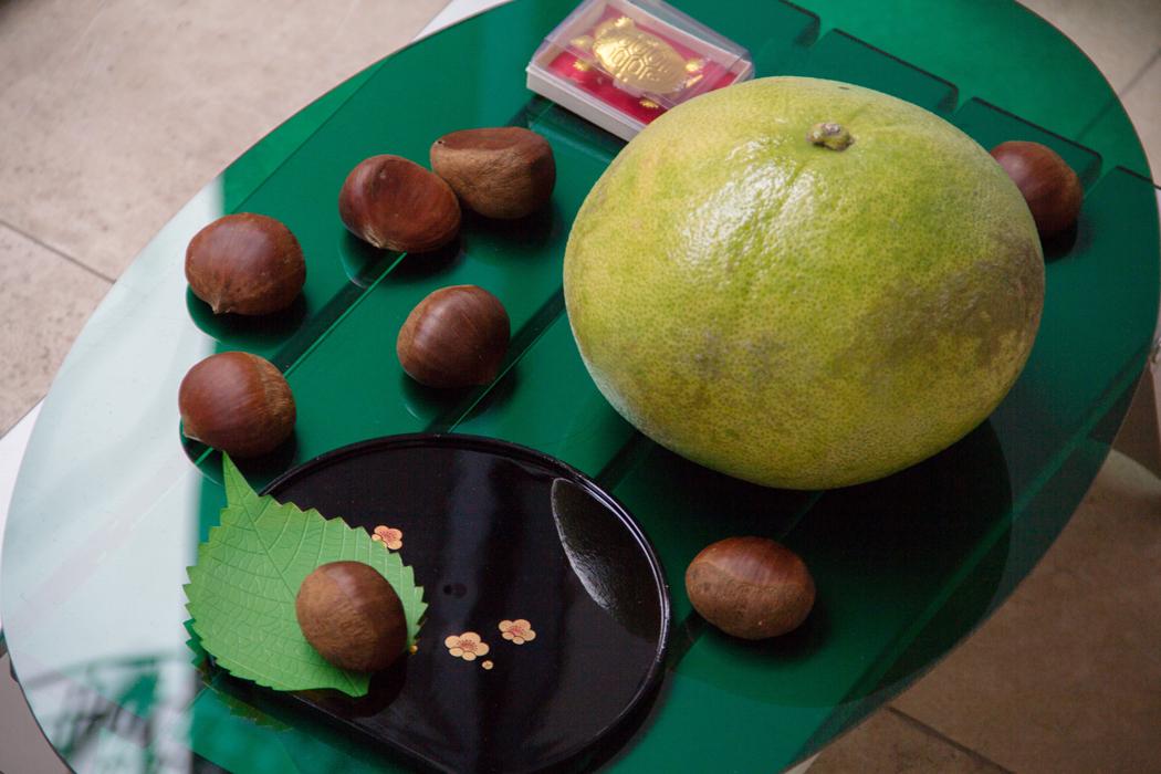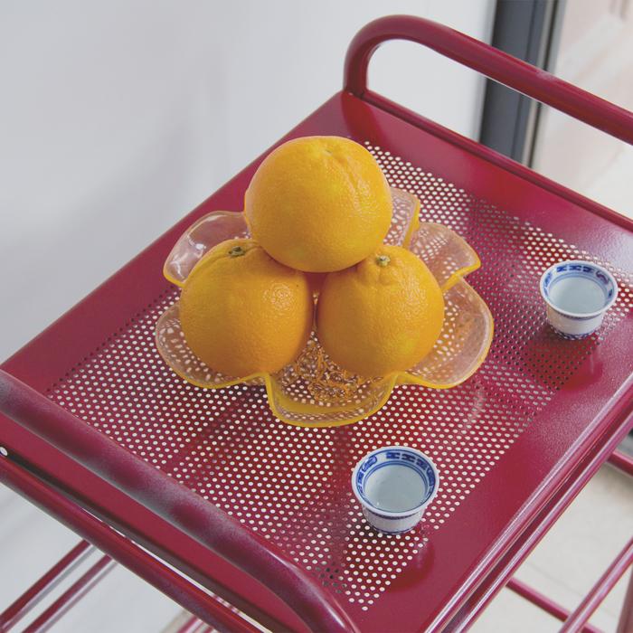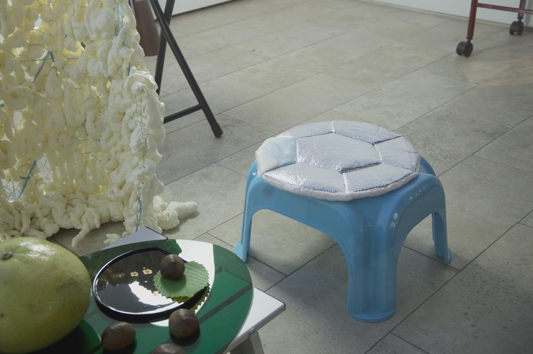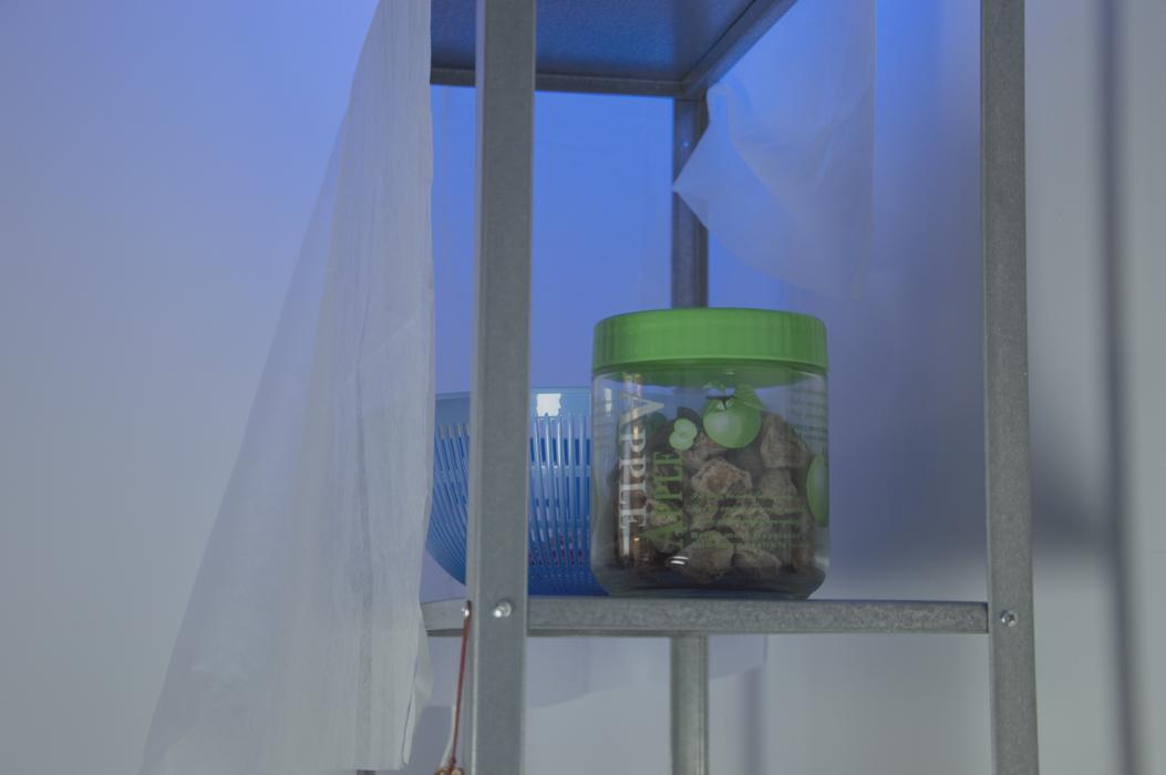 Vinyl, faux fur, aluminum foam, curved aluminum sheet, chicken wire, expanding foam, raffia, camping table, plexiglas, chairs, laser cut and engraved plexiglas, wax casts, LED bulb, light fixtures, chipboard, plates, oranges, cups, sour plums, containers, shelving unit, trolley, spray-paint, plastic tube, paraffin, beeswax, modelling wax, pigment, chipboard, light fixture, silicone